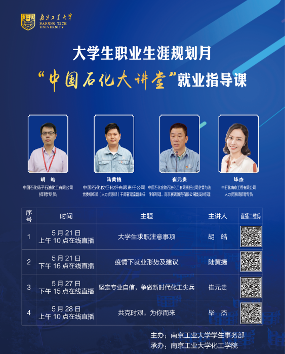 2020年“中国石化大讲堂”是米兰“2020职业生涯教育主题月”的重要内容之一,也是加强学校职业生涯规划和就业指导工作的重要环节之一,是学校直面疫情影响下的就业形势,加强校企协同,为在校大学生提供高端就业指导服务的有益探索,今后每年都将如期举办。