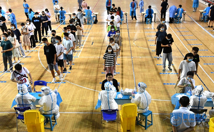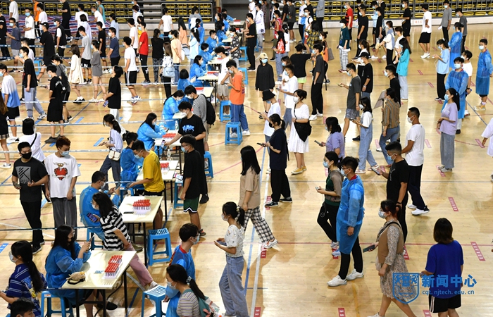 在各检测点,学校严格按照防疫要求划分出核酸检测等候区、登记区、采样区、缓冲区、清洁区和生活物资供应区、临时隔离区、污物处置区等区域,检测现场设置了20个采样台同步进行。在辅导员引导下,学生分批次、分时段到达检测地点,每10人一组,依次测温、扫码、登记、采样,以每小时4000余人的检测速度,迅速推进。检测结束的学生在志愿者指引下有序离场,不扎堆、不聚集,做到了“应检尽检、不落一人”。