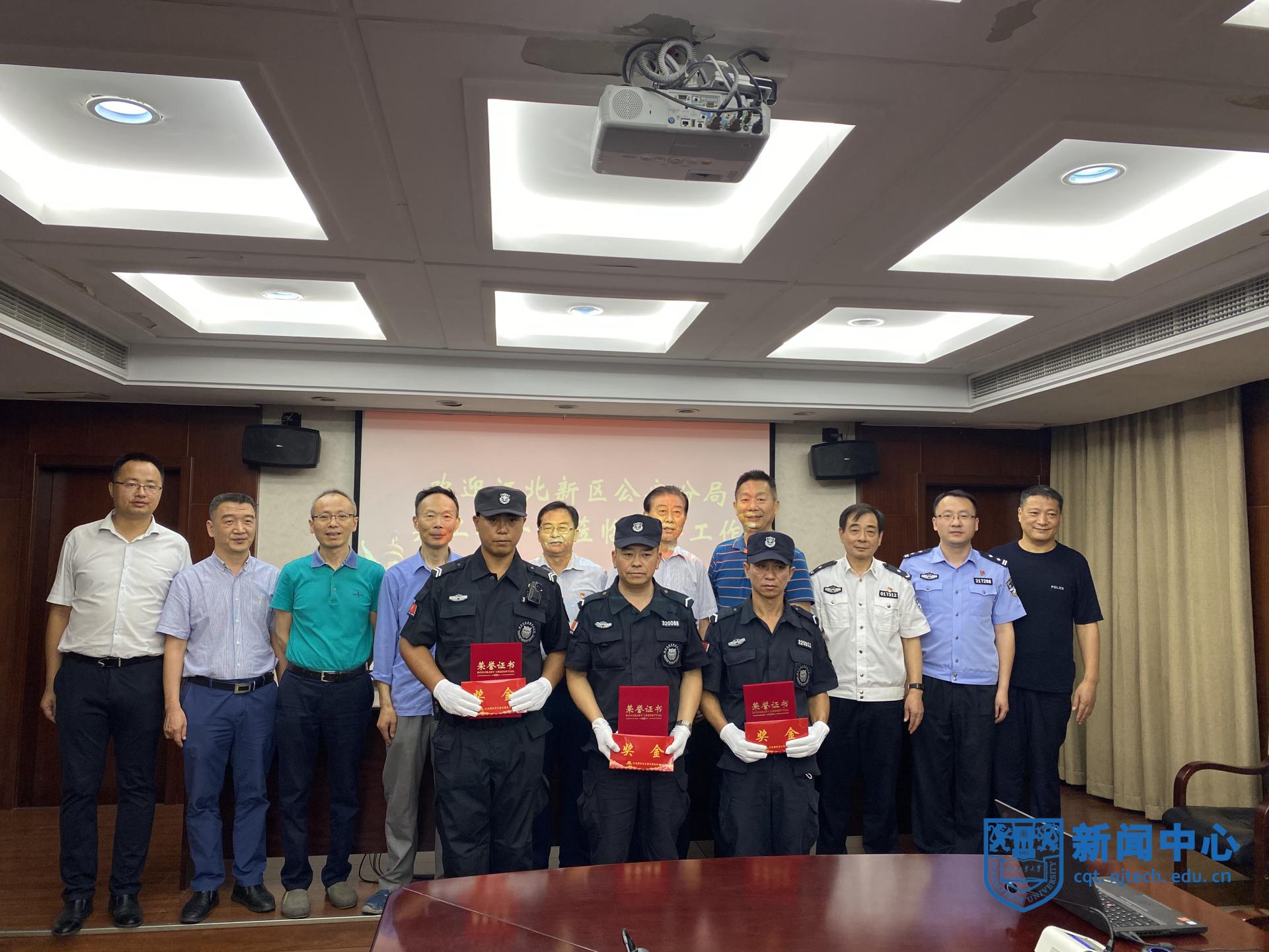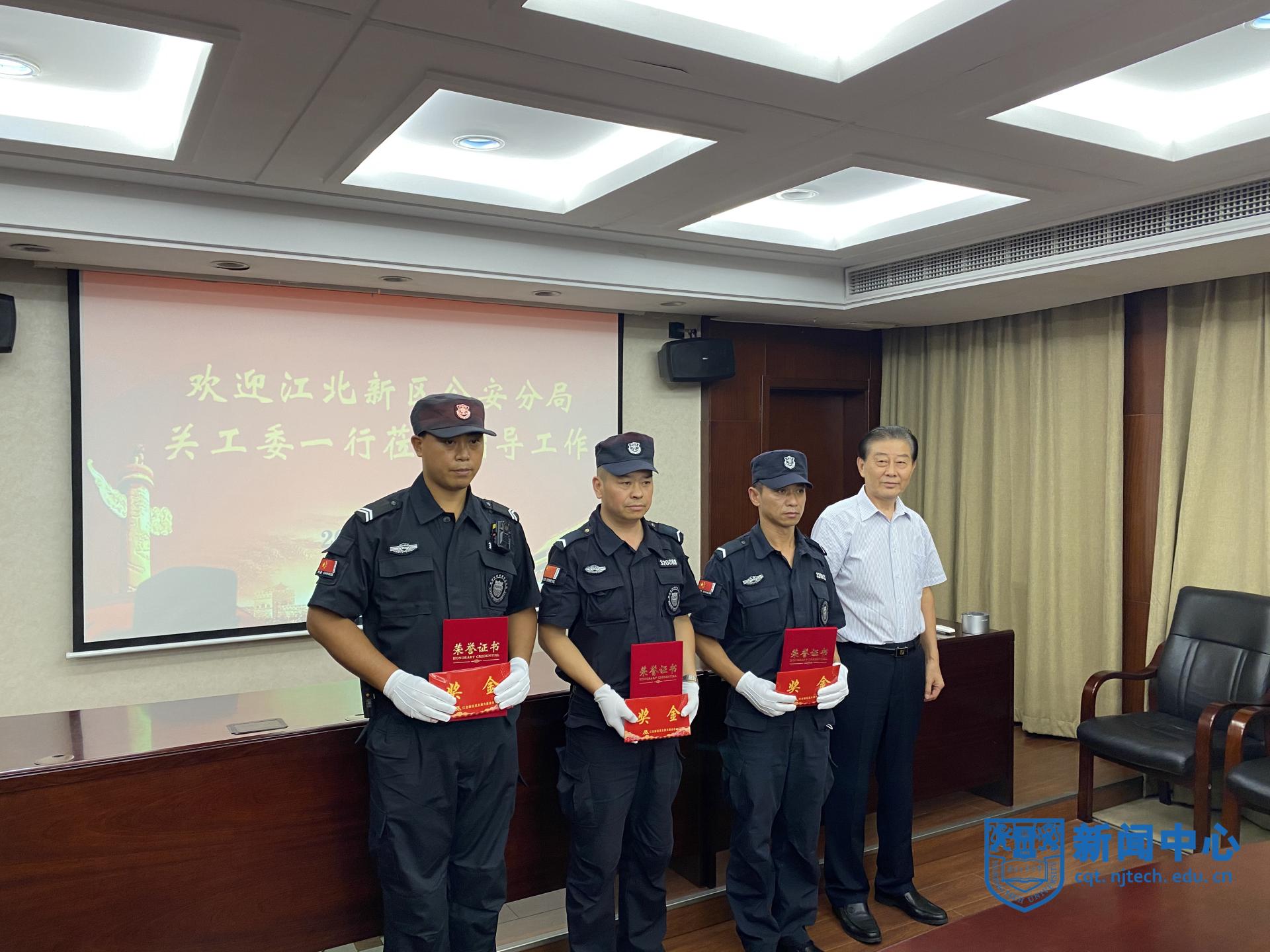 陆用升副理事长宣读了《关于表彰见义勇为先进个人的决定》,严守如理事长为学校3名安保队员董淑龙、赵祖海和马斌颁发“见义勇为先进个人”荣誉证书和奖金,对3人不顾个人安危、跳进冰冷的湖水勇救落水者的行为给予充分肯定。陶其岭副理事长介绍了江北新区见义勇为基金会工作概况和江北新区公安分局关工委工作情况。