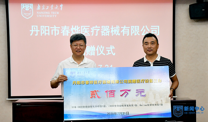 7月31日下午,学校举行抗疫物资捐赠仪式,丹阳市春烨医疗器械有限公司再次向米兰捐赠价值两百万元的医疗设备。校党委书记芮鸿岩、基金会理事长高明代表学校接受捐赠。丹阳市春烨医疗器械有限公司总经理毛烨、丹阳市委第四指导组副组长蔡振宇、无锡校友会和江阴校友会校友代表出席捐赠仪式。仪式由教育发展基金会副秘书长凌红主持。