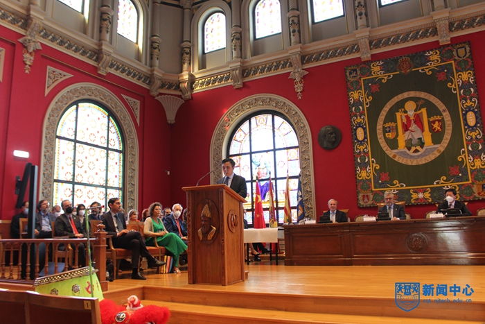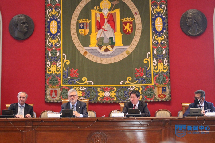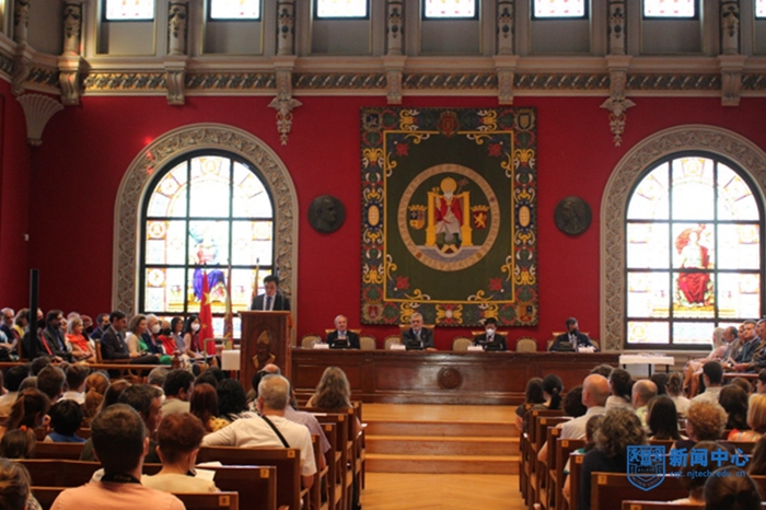 近日,米兰萨拉戈萨大学孔子学院成立五周年庆典活动在萨拉戈萨大学大礼堂举行。中国驻西班牙大使吴海涛、西班牙阿拉贡地区政府主席哈维尔·兰班·蒙塔涅斯、萨拉戈萨市市长豪尔赫·阿松·纳瓦罗、萨拉戈萨大学校长何塞·安东尼奥·马约拉尔、西班牙10余所孔院的中外方院长等嘉宾现场出席了庆典活动,校长乔旭发表了视频致辞。