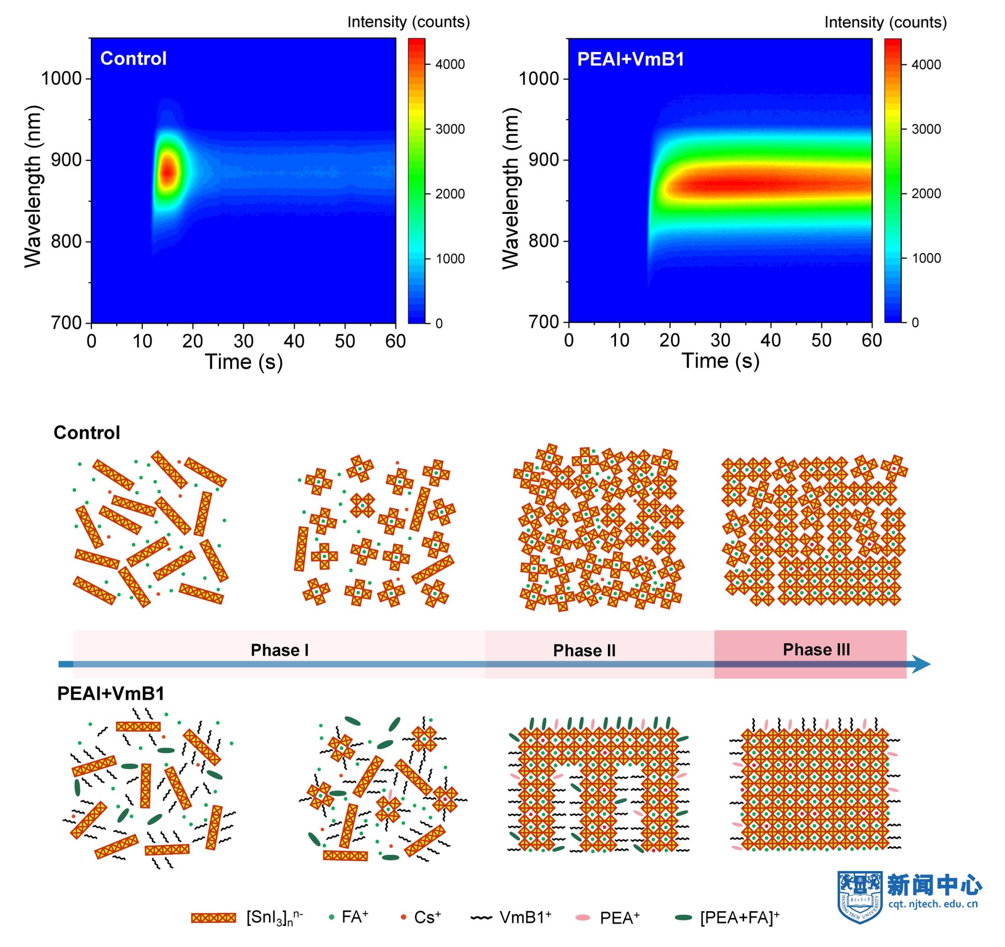 为此,黄维院士、王建浦教授、王娜娜教授、常进副教授团队利用原位光谱表征技术,揭示了锡基钙钛矿薄膜生长初期(10秒内)晶粒的快速聚集是缺陷态形成的主要原因。进而发现,通过在钙钛矿前驱体溶液中引入与碘化亚锡有强化学作用的一类添加剂(以维生素B1为代表),可以有效抑制钙钛矿晶粒的快速聚集,减少钙钛矿晶体生长过程中发光猝灭中心的形成。该研究团队在基于这一方法构筑的锡基钙钛矿薄膜上制备的LED器件外量子效率达到8.3%,是目前锡基钙钛矿LED的最高效率。这项工作为实现更高性能的锡基钙钛矿光电器件提供了全新的思路和途径,有望在近期取得重大突破。