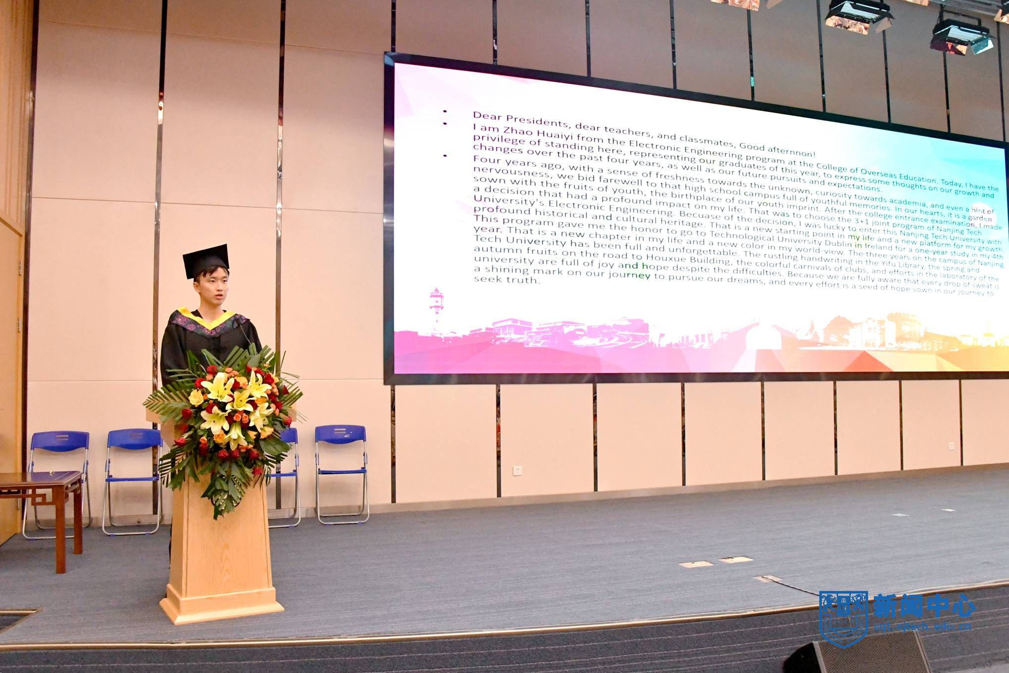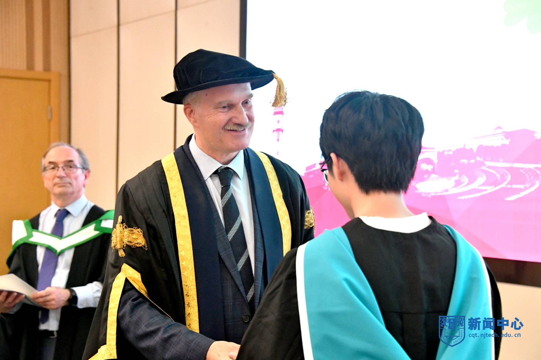 典礼开始,海外教育学院院长王志荣宣读本届毕业生名单,蒋军成校长和David FitzPatrick校长为毕业生逐一颁发两校学位证书,并合影留念。毕业生代表、电子信息工程(国)1902班赵怀逸同学与即将出国学生代表、制药工程(国)2002班尹成泰同学先后发言,表达了对学校倾心培养的感激之情。