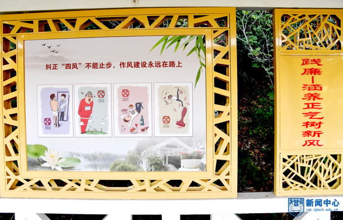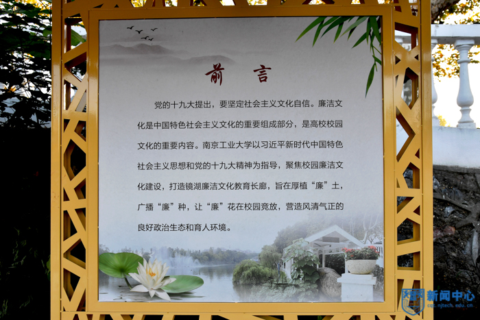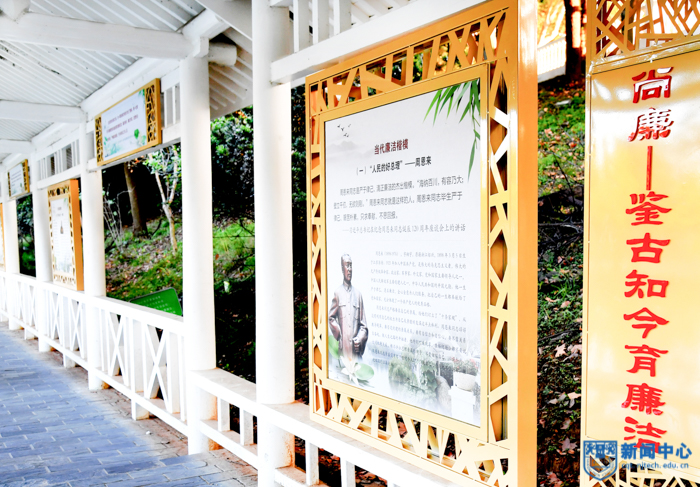 长廊内容紧扣习近平总书记十八大以来关于全面从严治党的重要论述和廉洁自律的相关要求,集思想性、教育性、知识性、实用性、艺术性等于一体,形式新颖、形象生动、寓教于行,让广大师生在一览镜湖美景之余深受教育。长廊分为“知廉”、“尚廉”、“践廉”3个板块。“知廉”板块主要展示中国共产党廉洁自律准则、高校教师行为准则、学生行为准则等,旨在教育师生学廉守廉,自律笃行;“尚廉”板块主要展示了党历史上的廉洁楷模,如“人民的好总理”周恩来、“党的好干部”孔繁森等,以及古代廉洁人物事迹,旨在教育师生崇廉尚廉,涵养根基;“践廉”板块主要以漫画形式展示了纠“四风”不能止步,提出学校推进廉洁文化教育的新举措,旨在教育师生颂廉树廉,弘扬正气。