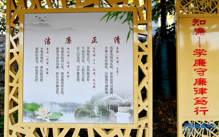 廉洁文化教育长廊依托学校镜湖的玉壶长廊进行建设。 “夫以铜为镜,可以正衣冠;以史为镜,可以知兴替;以人为镜,可以明得失”。“一片冰心在玉壶”是唐代王昌龄《芙蓉楼送辛渐》诗中的名句,冰在玉壶之中,比喻人的清廉正直。“镜”湖与“玉壶”廊之名与廉洁文化内涵恰好呼应。